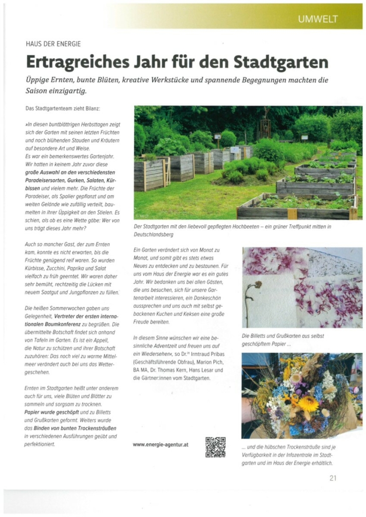 In der Ausgabe 2025/4 des Stadtmagazins Deutschlandsberg wurde über unseren Stadtgarten und die Tätigkeiten im Rahmen unseres gemeinnützigen Beschäftigungsprojektes „Haus der Energie“ der StAF berichtet. Wir bedanken uns sehr herzlich bei Elke Kleindinst für den schönen und informativen Beitrag.
