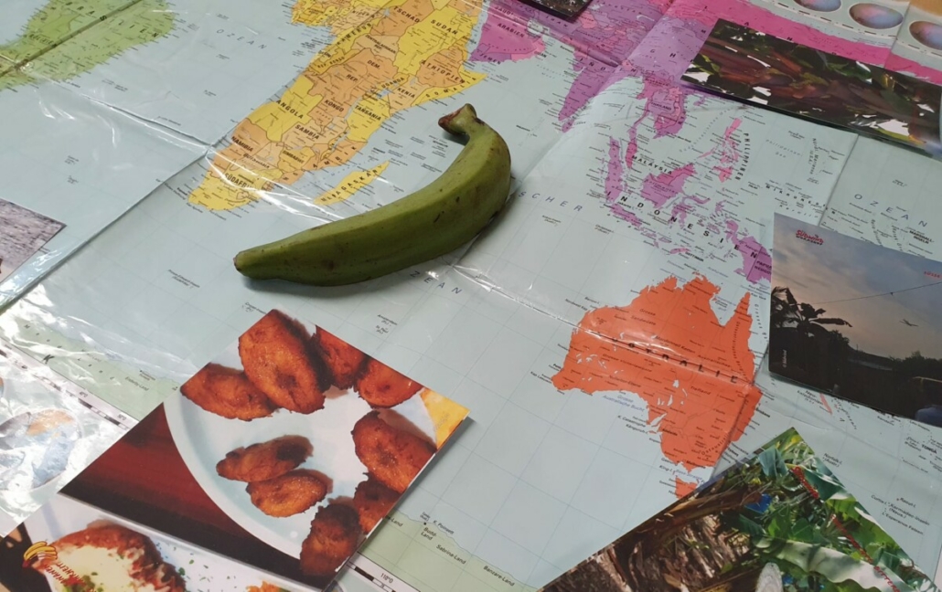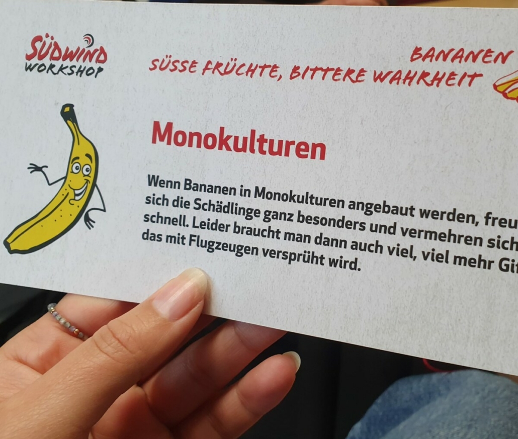 Elisabeth Holter von der NGO Südwind führte einen sehr interessanten Workshop zum Thema Lebensmittel – Anbau und Transport am Beispiel der Banane und Kochbanane im Kontext zum Klimaschutz durch. Als besonderes Highlight gab es zum Abschluss selbstgemachte Kochbananen-Chips.